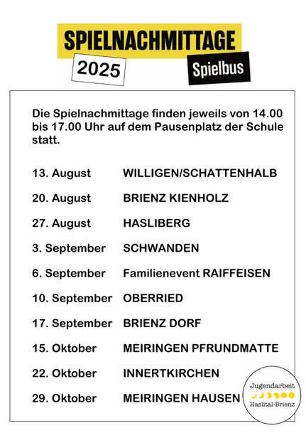 Sa: 25.10.25 | 09:00 - 14:00 | Spielbus | Sportplatz Schwanden | |