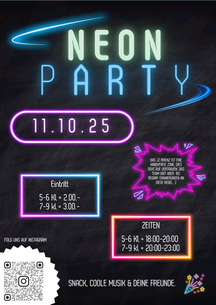 Am letzten Samstag in den Ferien (11.10.25) findet eine Neon-Party statt.