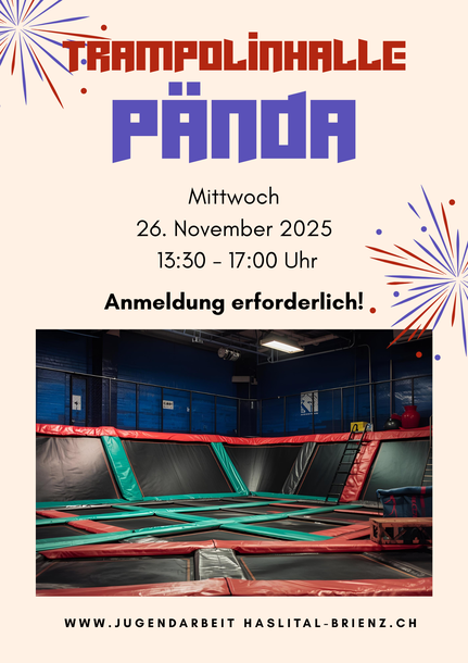 Wir gehen in die Trampolinhalle in Wilderswil, melde dich jetzt an, es hat nur begrenzte Plätze.