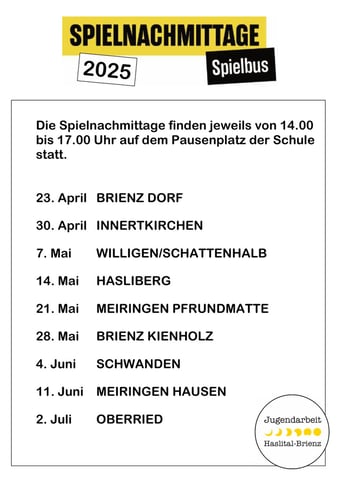 Von April bis Oktober verwandeln wir mit dem Spielbus jeden Mittwoch von 14:00 bis 17:00 Uhr die Pausen- und Sportplätze der Schulhäuser von Oberried bis Hasliberg in bunte Bewegungslandschaften! Jedes Schulhaus wird dabei zweimal pro Saison besucht.